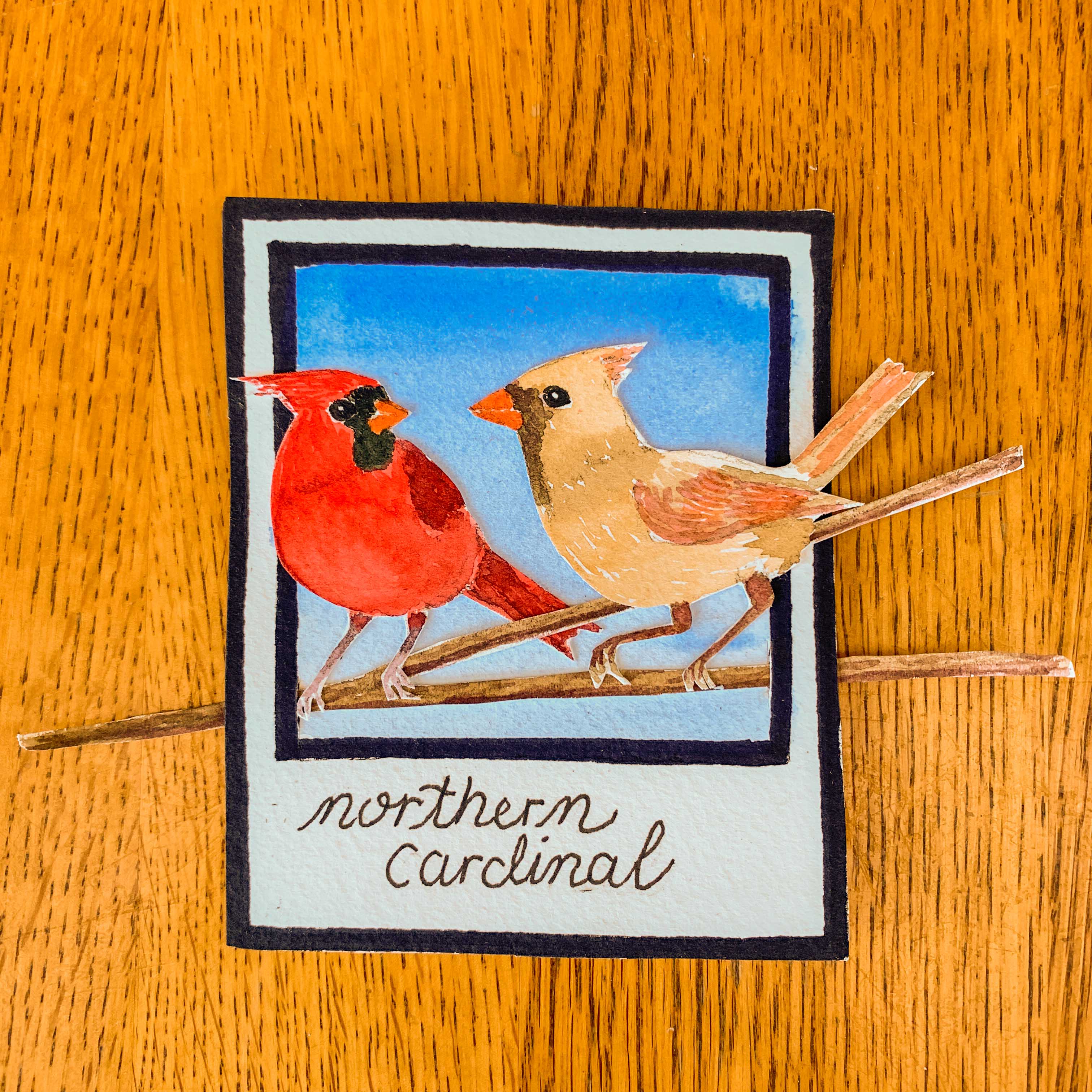This original watercolor painting is of a pair of American Cardinals. The cardinals and branch were painted separately, then carefully cut out and glued, using archival glue to the “polaroid” frame which is approximately 3.5″ x 4.5″